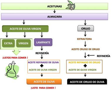 Por último tenemos el aceite que pierde la denominación virgen, el ‘aceite de oliva’ a secas. Este aceite es una mezcla de aceite de oliva refinado y aceite de oliva virgen o virgen extra. El consumidor desconoce que el aceite de oliva refinado procede del aceite de Oliva Lampante, el peor de los aceites de oliva vírgenes obtenido en la almazara, que tiene serias alteraciones en sus físico-químicos o en sus características sensoriales. La reglamentación europea impide su consumo directo y necesariamente se le ha de someter a un proceso de refinado, es decir ‘rectificado’, en unas industrias denominadas Refinerías, para eliminar sus defectos y hacerlo comestible, mediante tratamientos químicos y térmicos (200-300ºC) dan lugar al aceite refinado, que presenta características sensoriales prácticamente neutras, sin sabor ni olor, el cual no se consume directamente y se usa para componer otros aceites. Es importante saber que durante el proceso de refinado se eliminan los componentes saludables (tocoferoles, polifenoles, esteroles, vitaminas). Además del aceite de oliva ‘a secas’, el aceite de orujo de oliva y todos los aceites de semillas, son sometidos al proceso de rectificado anterior comentado.